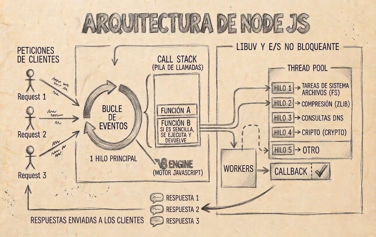 El dibujo simboliza a unos clientes que realizan peticiones que son enviadas al bucle de eventos, allí para cada petición habrá que realizar una serie de operaciones que conllevarán llamar a una o varias funciones. Los intérpretes de JavaScript van ejecutando el código mediante una pila de llamadas. Cuando alguna función se corresponde a una llamada potencialmente bloqueante de las que gestiona Node.Js entonces pasa su ejecución al hilo correspondiente.